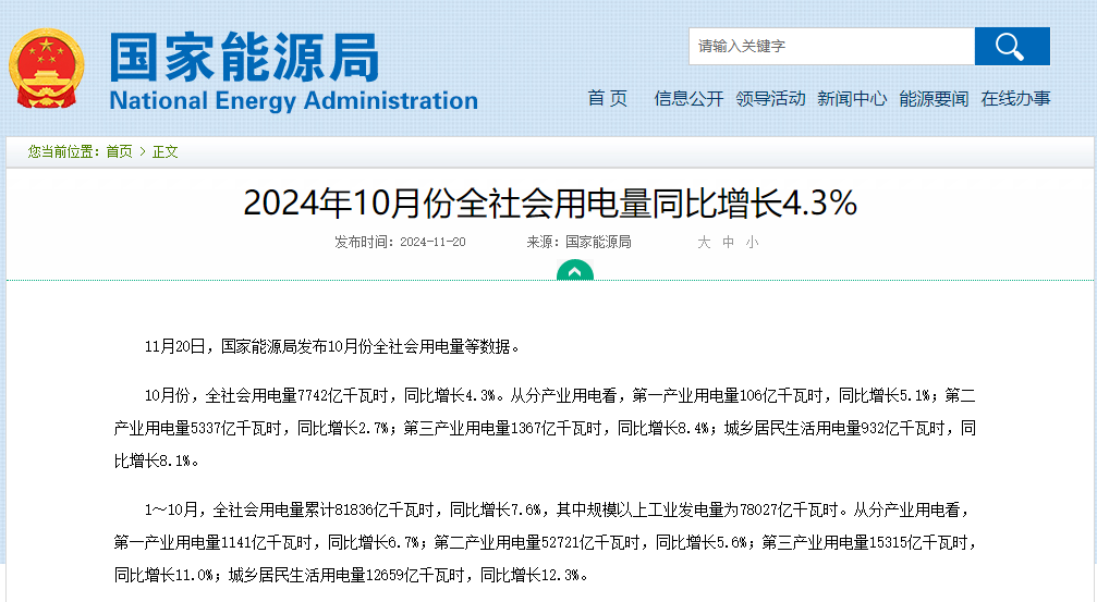 11月20日,国家能源局发布10月份全社会用电量等数据。