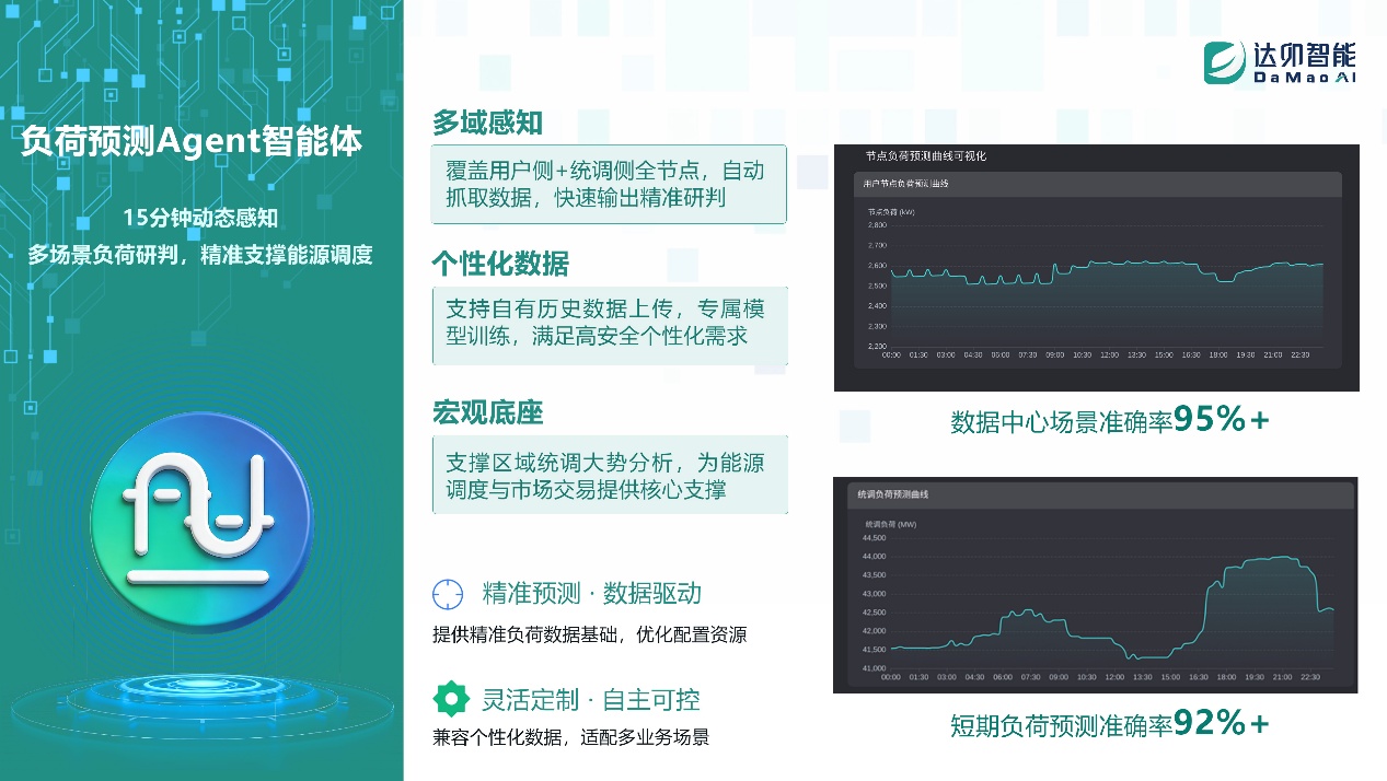 负荷预测Agent:针对数据中心、工业负荷等高精密场景实现动态滚动预测,核心场景预测准确率稳定保持高位,精准捕捉算力波动与用电峰谷变化,为调度交易筑牢数据基础。