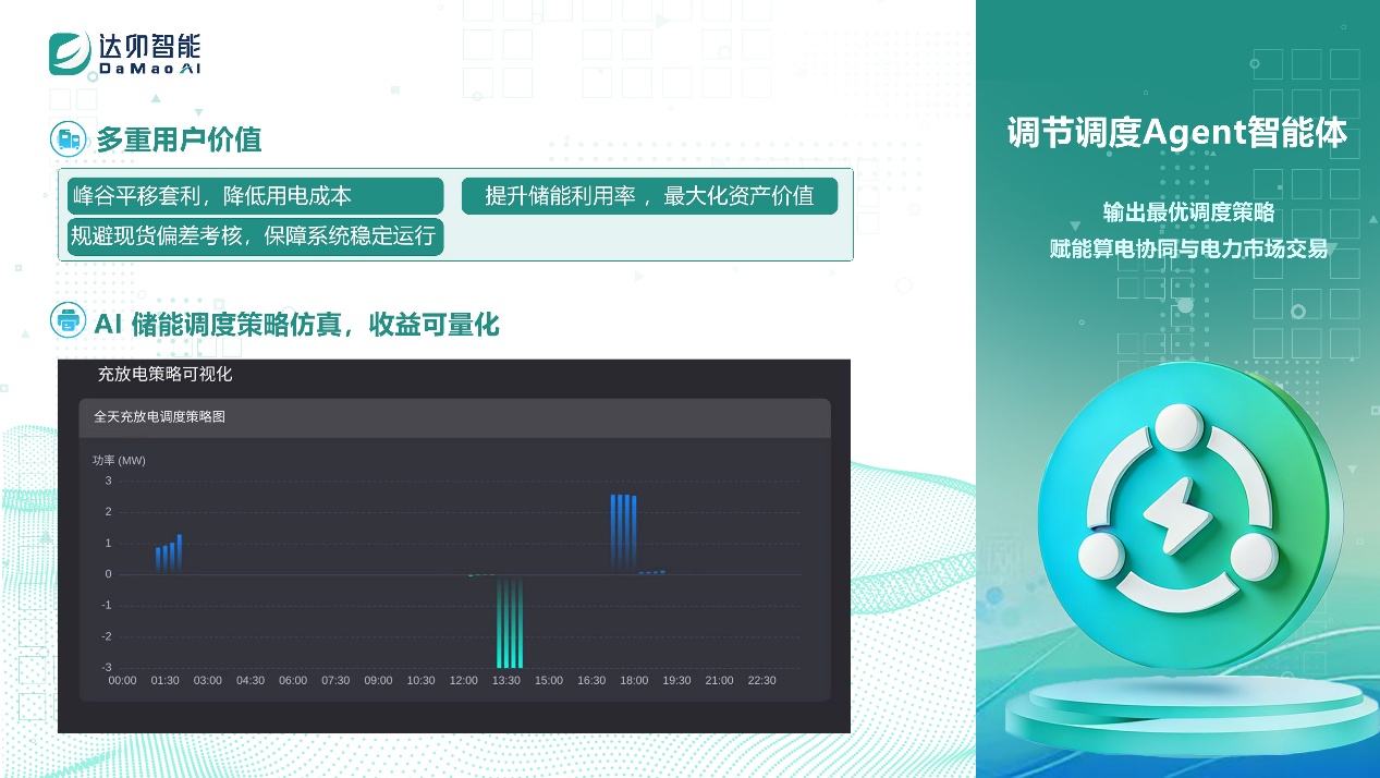 调节调度Agent:承担算电协同与储能管理核心职能,自动生成最优充放电策略,实现峰谷套利、负荷平抑,最大化储能资产价值,并保障负荷运行与电网接入双稳定。
